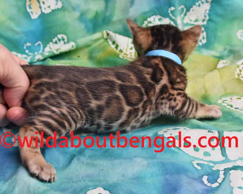 Gorgeous clouded leopard like Boy with big bold black outlined rosettes. He is just purrfection! He has long baby fuzzies right now, distorting his markings some but this will clear up when he gets older to reveal stunning markings. I try to show them from different angles because the lighting and fuzzies are better or worse depending on the viewing angle. He should be a big boy like his dad Merlin when he is grown. He will have a golden brown background with the inky black outlined rosettes that will really stand out. He has a super soft pelt and will have glitter also. His eyes will be bright green as an