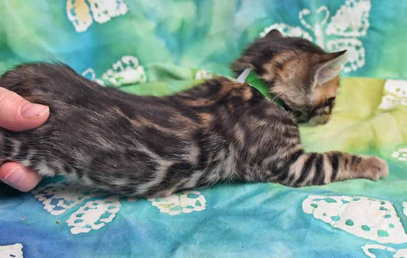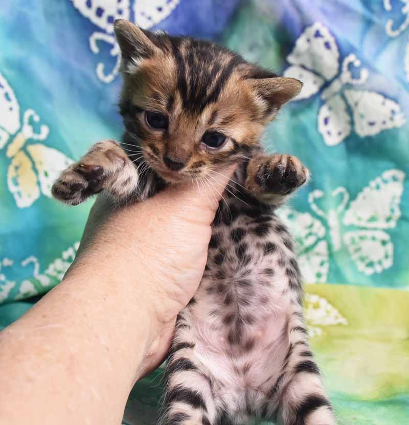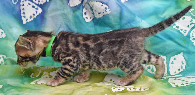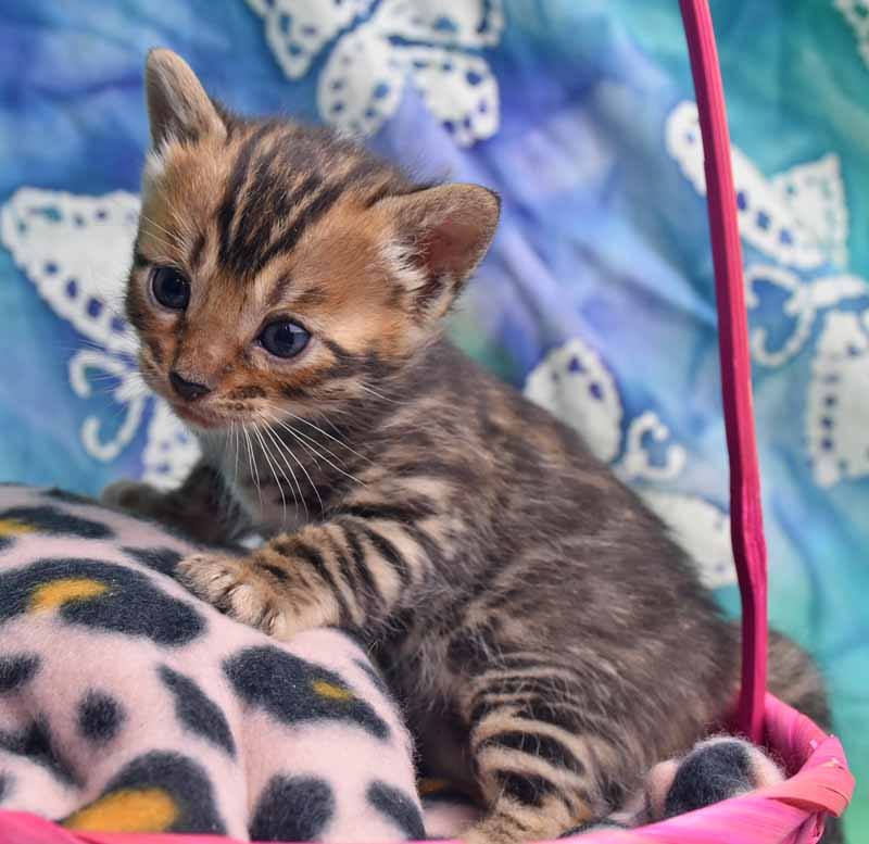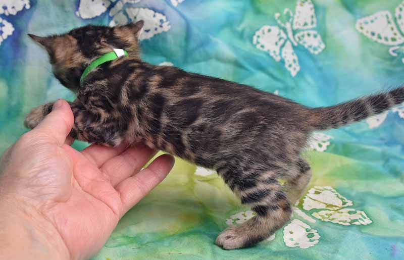 This stunning boy is the darkest color in the litter and also the biggest in the litter. He even has a black nose which really gives a more exotic look and more unique because most bengal's noses are pink! He has long very dark baby fuzzies so his markings are more distorted currently but don't let that fool you! He has HUGE rosettes in inky jet black outlines and medium brown colored centers on a light gold background. I tried to get photos from different angles because the fuzzies can look better and worse from varying angles, so you can get a better idea of his markings under the fuzz. The fuzzies will clear up as he gets older and he will be quite stunning. Darker markings also won't fade or lighten as he gets older. His eyes will be bright green as an