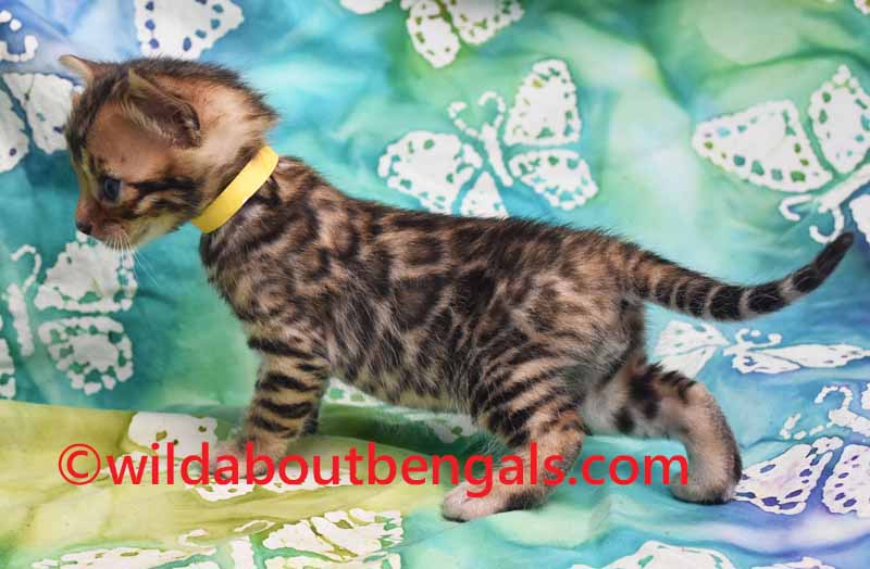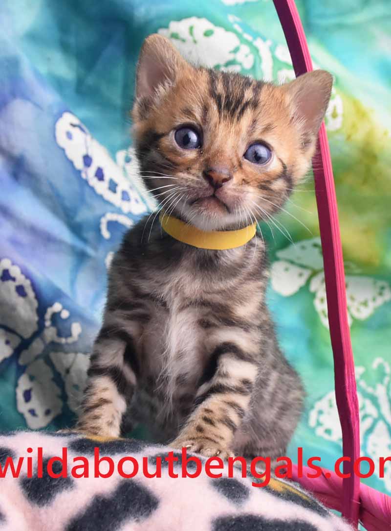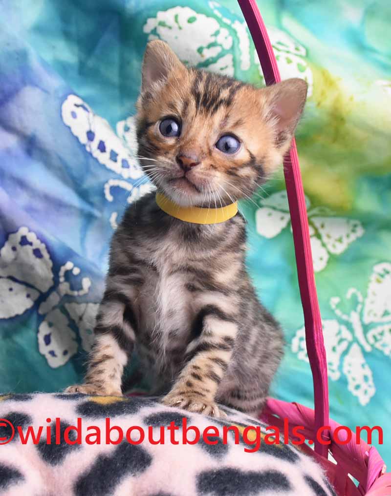 What a stunning donut rosetted golden boy! Just look at the sweet adorable face! This boy has really nice donut ringed rosettes with dark outlines and lighter centers. He will be a lighter golden background. He has some baby fuzz but it is not as prominent right now as some of his brothers, and it will clear up more as he gets older. His eyes will be bright green as an adult, they are not fully developed at this age yet. He has a very nice head and facial features with smaller ears for a nice wild look like his Asian leopard cat ancestor. He is very sweet and playful and loves attention. Lakota and Merlin are super sweet affectionate bengals and their kittens are the sweetest! If you are looking for a very nice donut rosetted and affectionate bengal, this boy is for you!